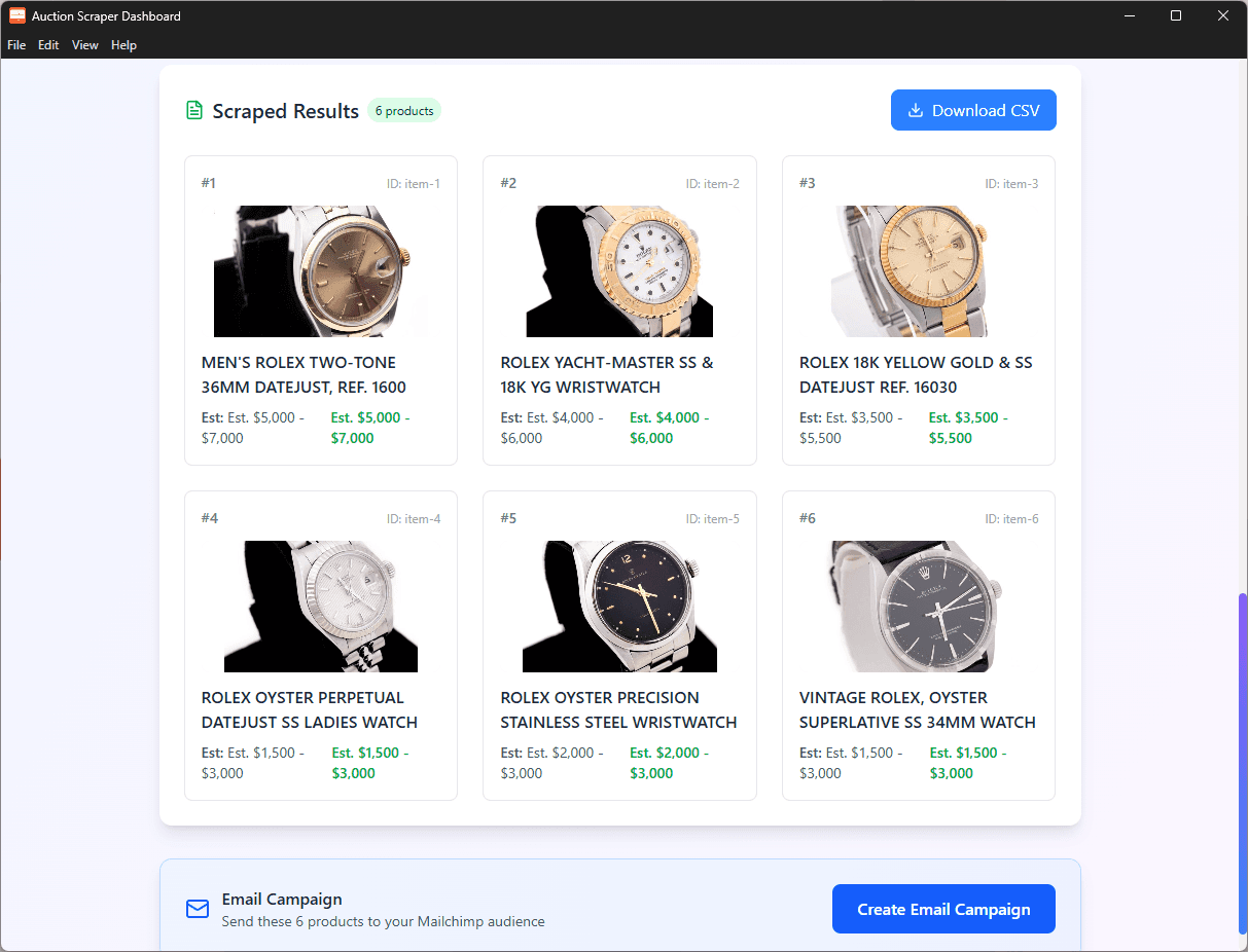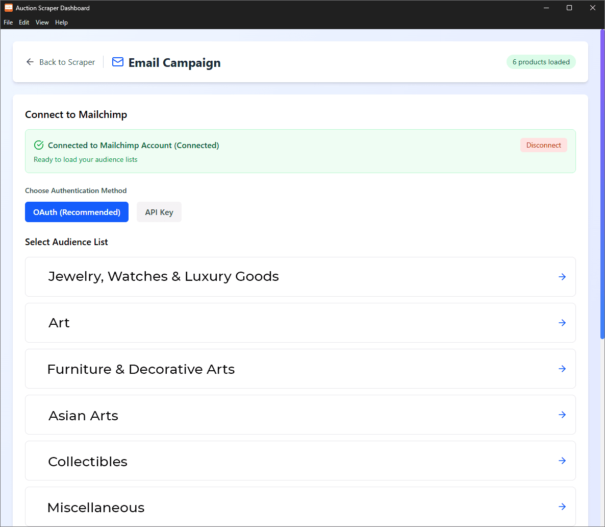 Seamless Mailchimp Integration — Synced scraped products into ready-to-send Mailchimp campaigns with professional templates.
