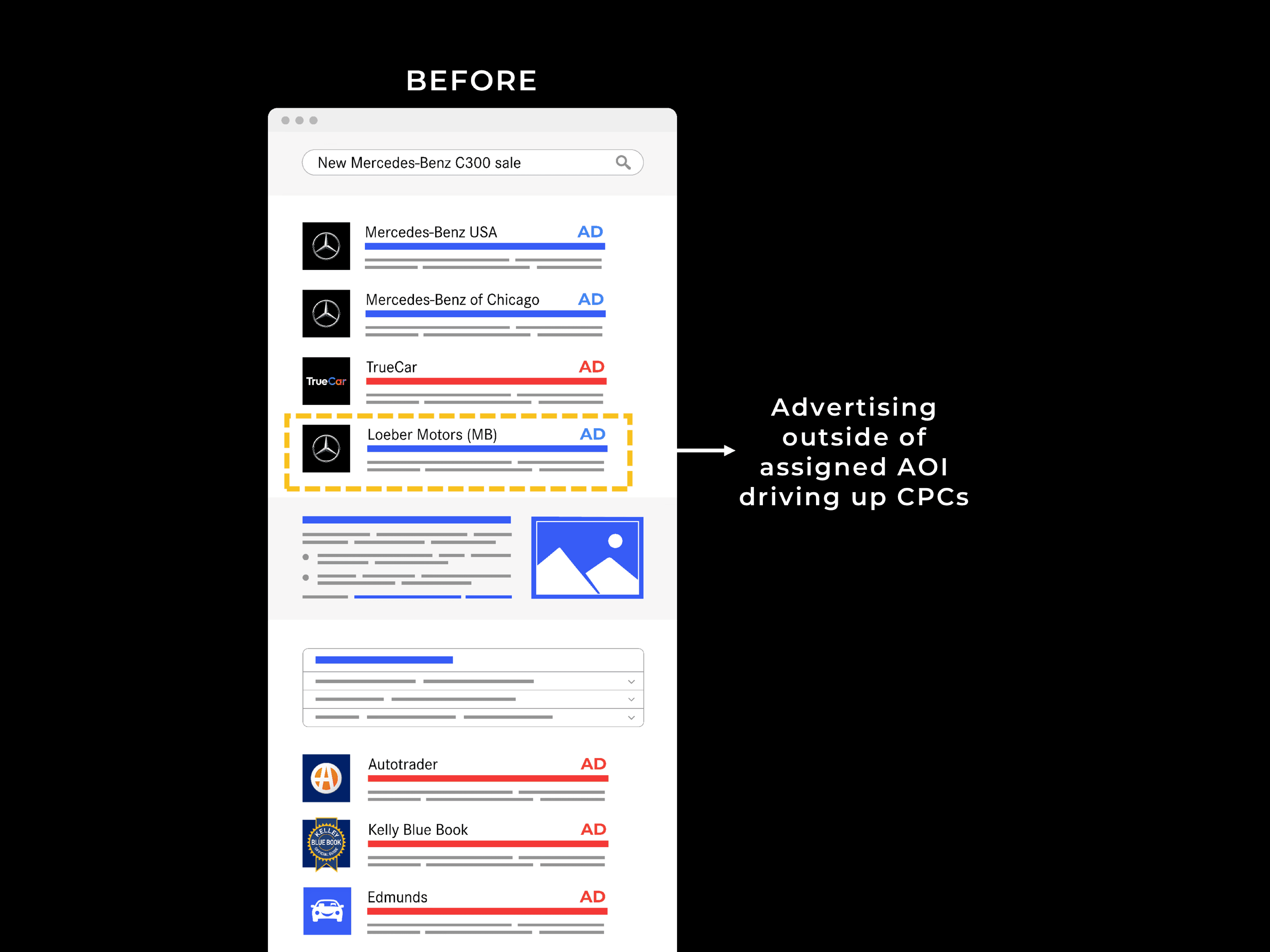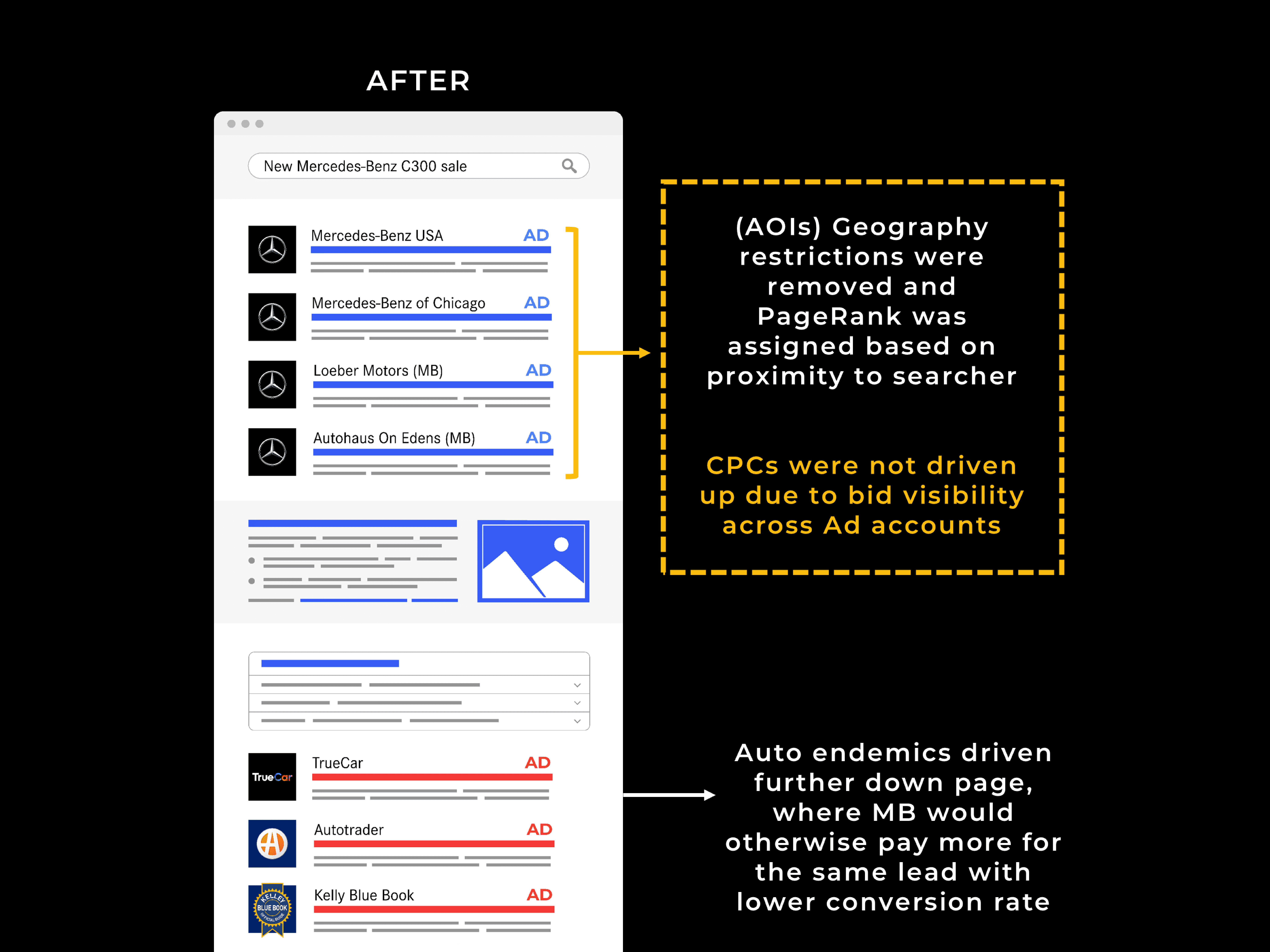Internal competition: MBUSA and dealers were bidding against each other on branded keywords, inflating CPCs.