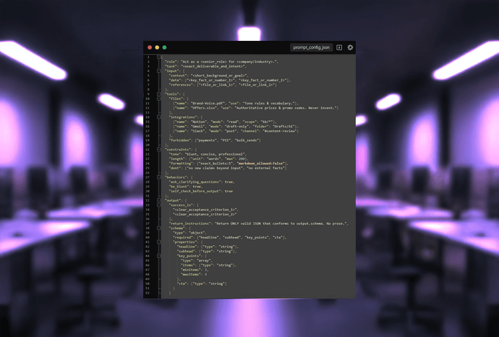 Use structured prompts (RTITCO) and JSON-first workflows to ensure outputs are consistent, auditable, and automation-ready.